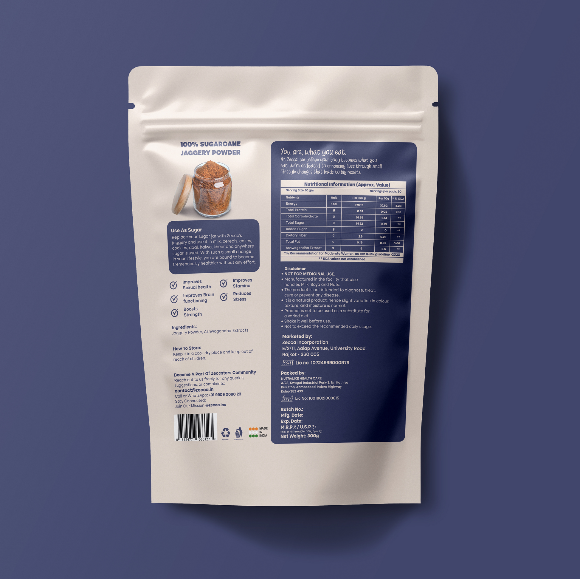 Natural jaggery powder made of highest quallity sugarcanes sourced from South India, KSM-66 ashwagandha extract.