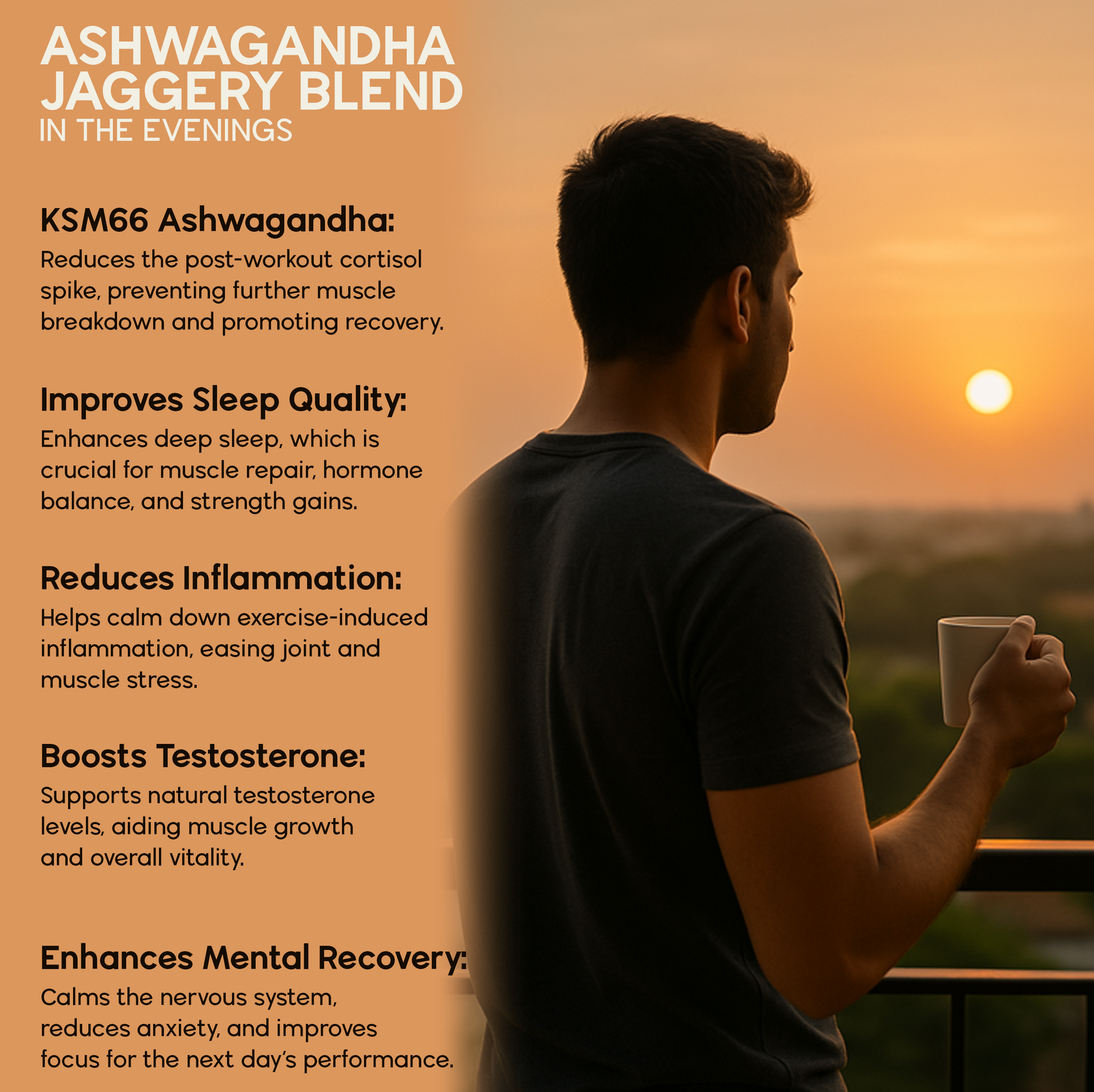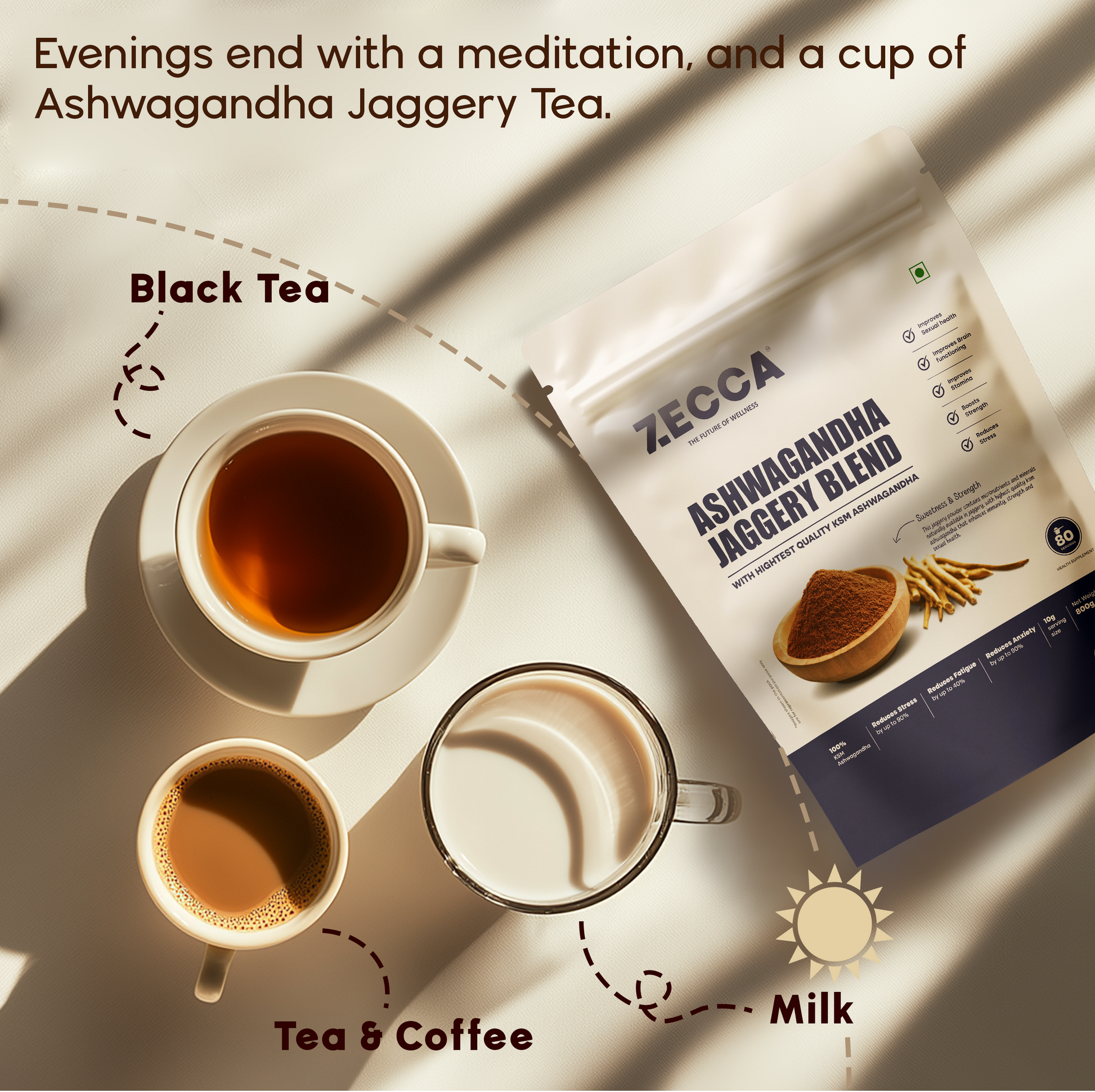 - Ashwagandha Jaggery Blend: Natural jaggery powder made from premium South Indian sugarcanes, KSM-66® Ashwagandha extract.