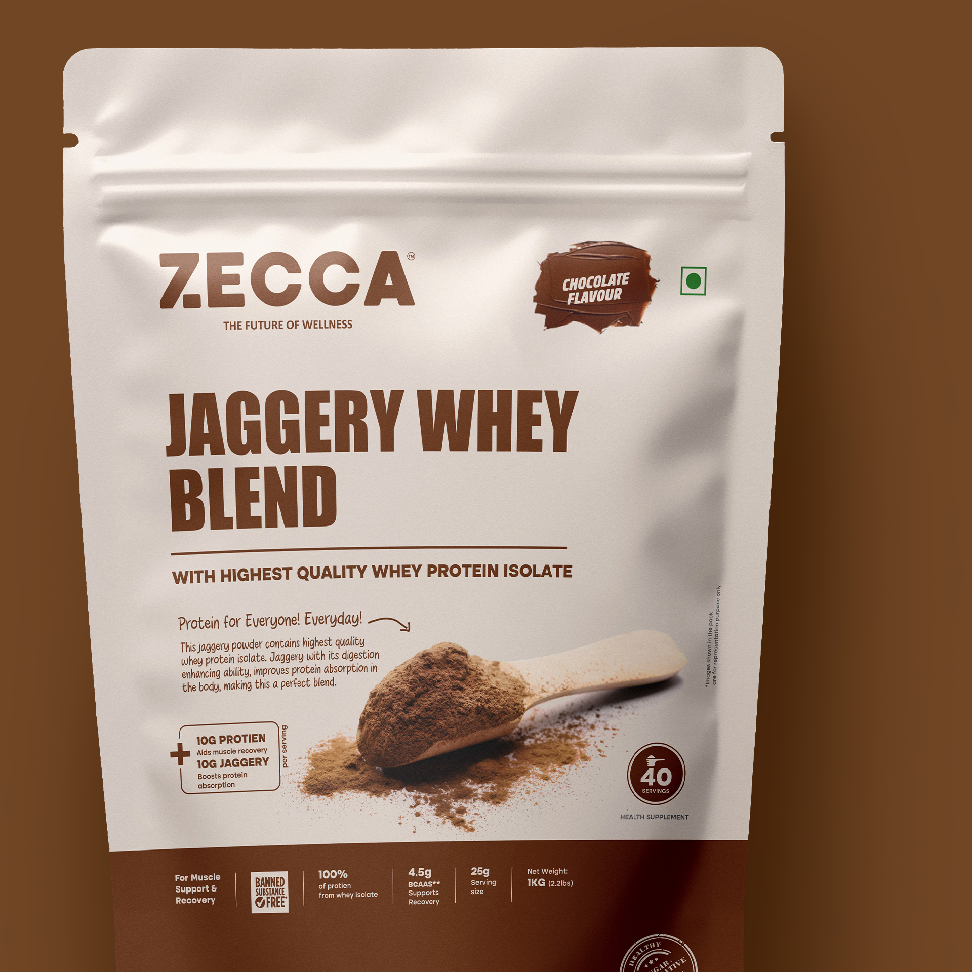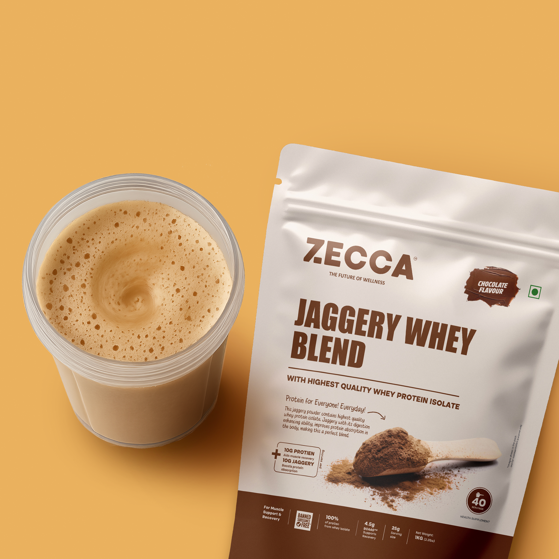 - Jaggery Whey Blend: 50% natural jaggery powder (South India), 50% whey protein isolate, and a touch of cocoa powder for flavor.